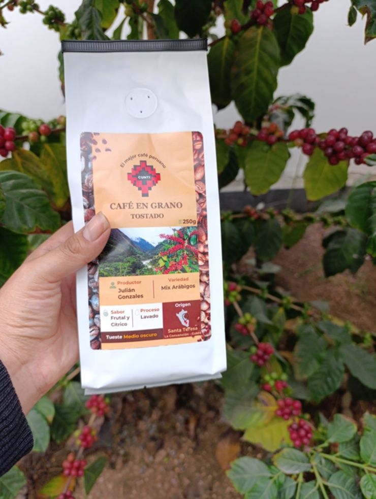 250g CUNTI Café en grano tostado y seleccionado en tueste medio-oscuro, productor Don Julián Gonzales desde la provincia de La Convención, Región Cusco